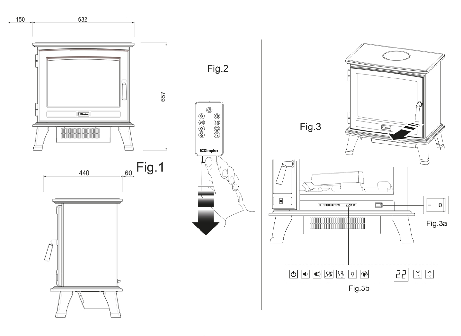 Heldere beglazing en geïntegreerde bovenverlichting versterken het vuurbeeld, zelfs bij weinig licht. De openklapbare deur en realistische houtdecoratie maken de beleving compleet. Met één druk op de knop regelt u de vlammen, het geluid en de temperatuur, via het display of de afstandsbediening.